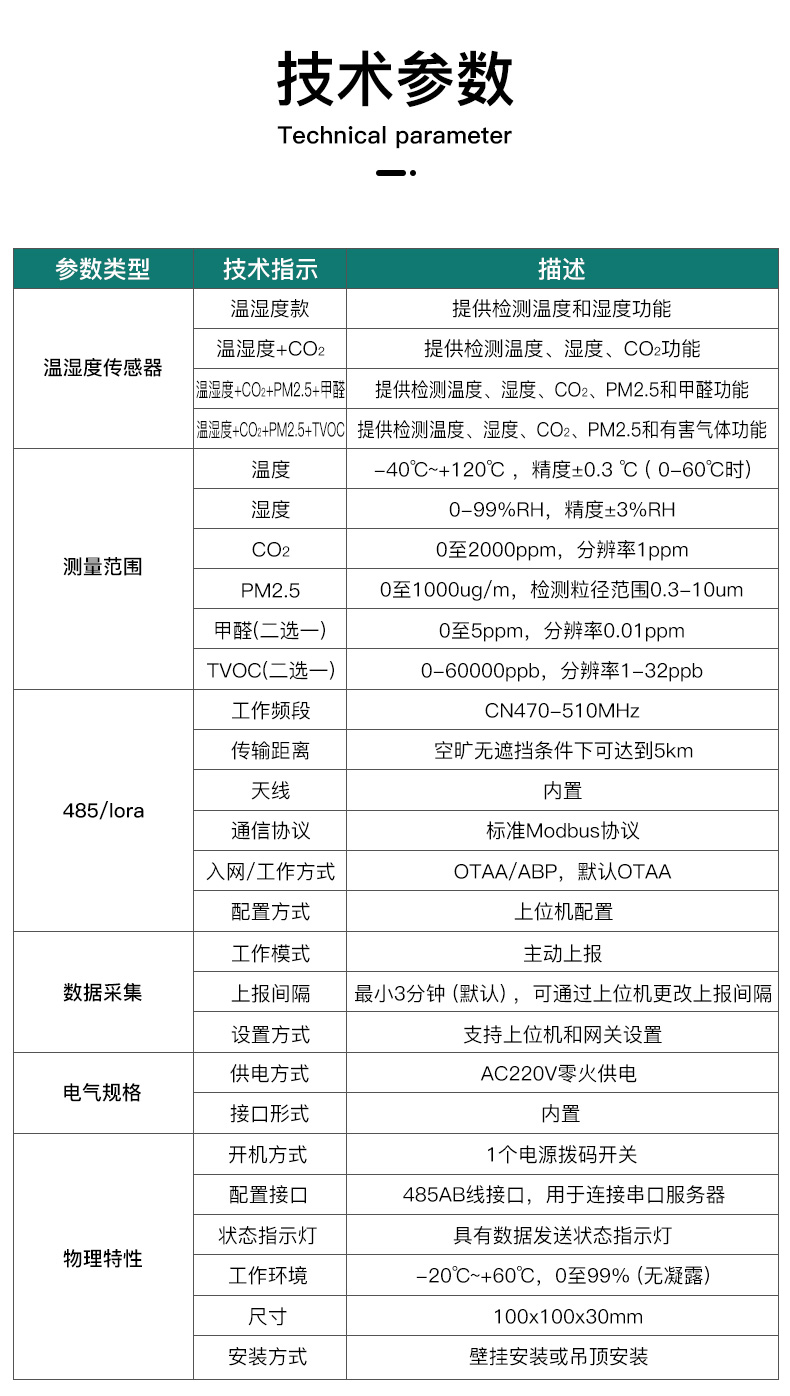 温湿度款:提供检测温度和湿度功能温湿度+CO2:提供检测温度、湿度、CO2功能温湿度+COz+PM2.5+甲醛:提供检测温度、湿度、CO2、PM2.5和甲醛功能温湿度+COz+PM2.5+TVOC:提供检测温度、湿度、CO2、PM2.5和有害气体功能