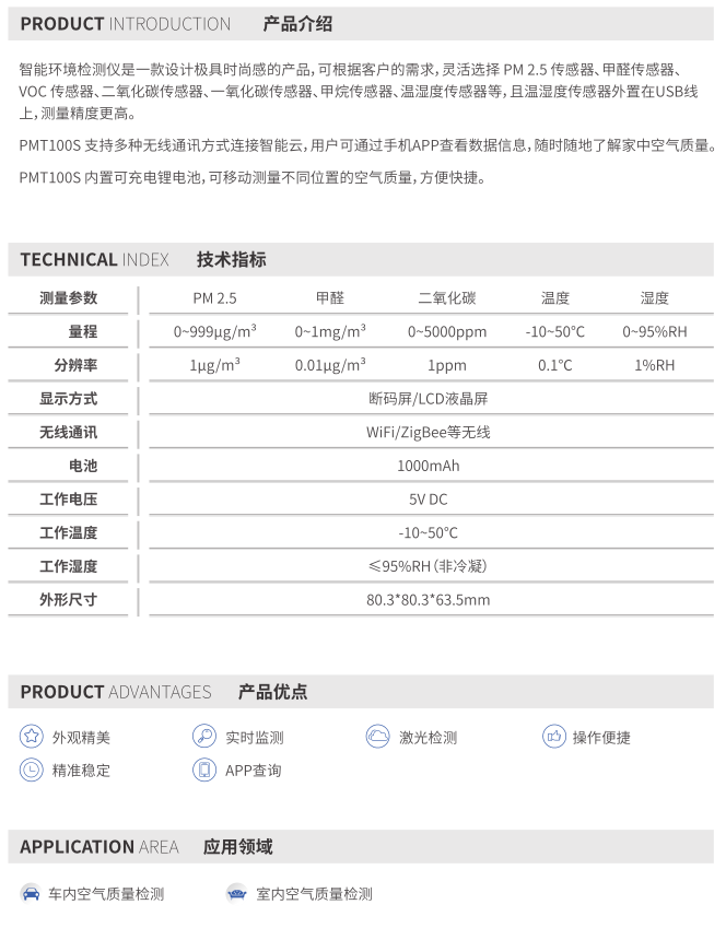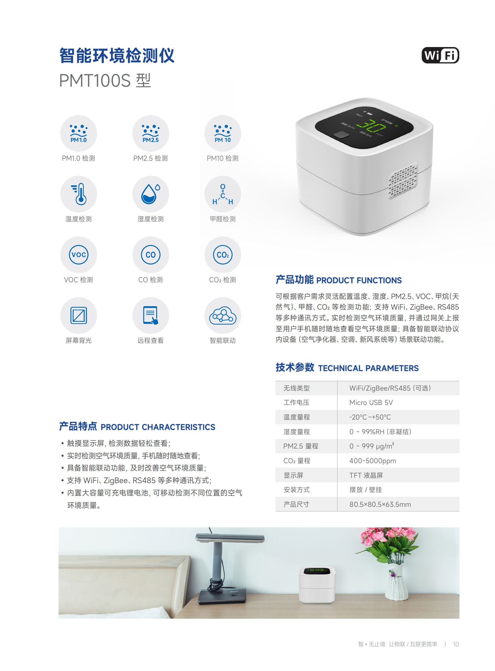 可根据客户需求灵活配置温度、湿度、PM2.5、VOC、甲烷﹙天然气)、甲醛、CO2 等检测功能;支持 WiFi、ZigBee、RS485 等多种通讯方式。实时检测空气环境质量,并通过网关上报至用户手机随时随地查看空气环境质量;具备智能联动协议内设备(空气净化器、空调、新风系统等)场景联动功能。