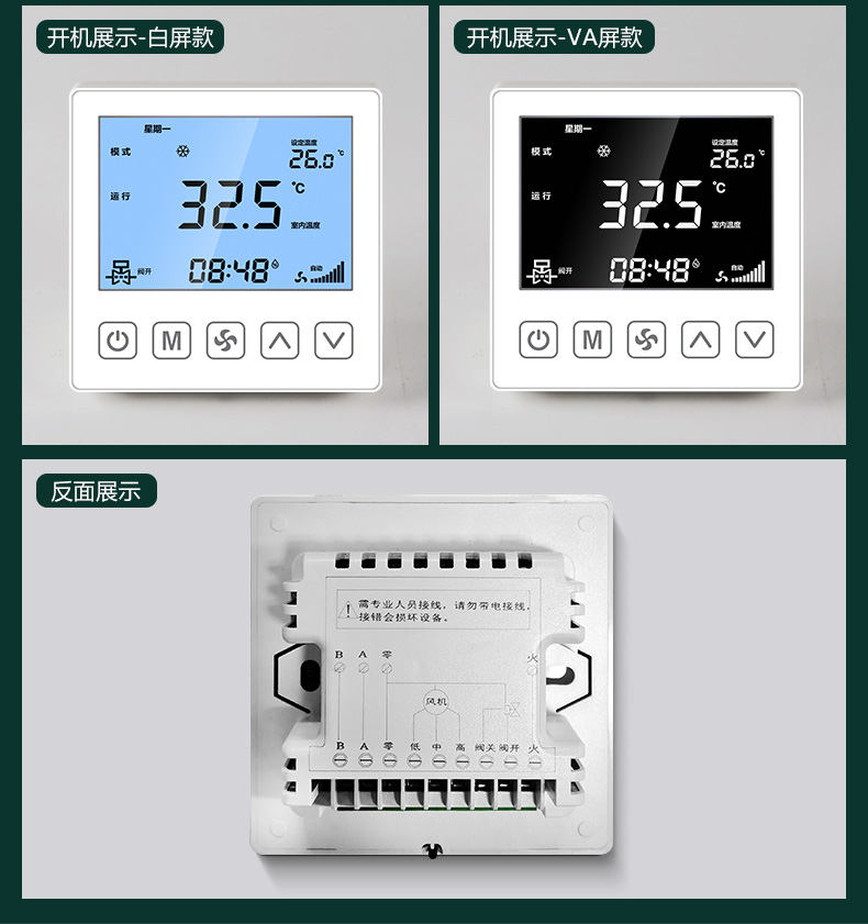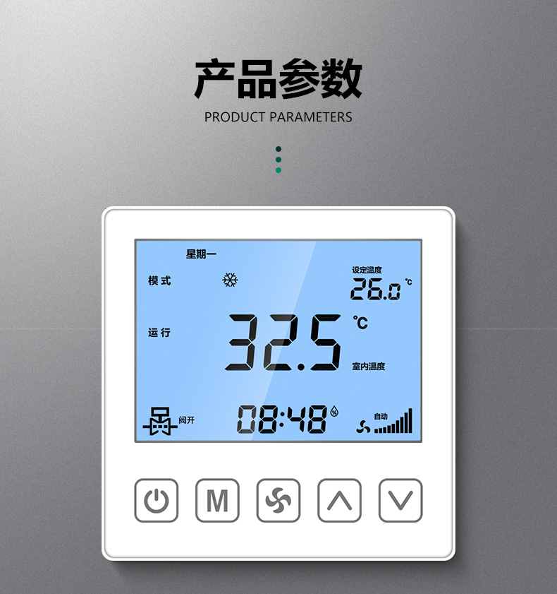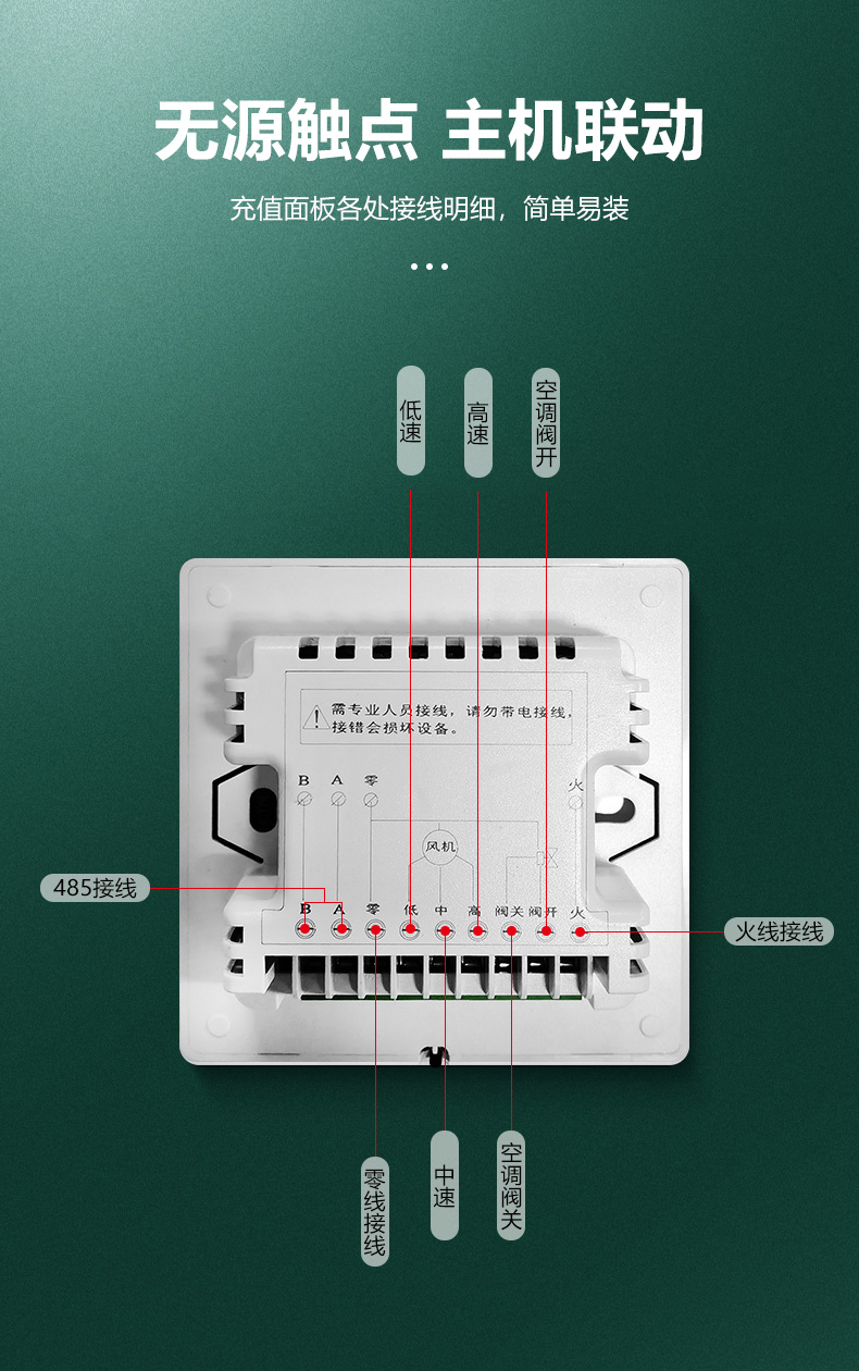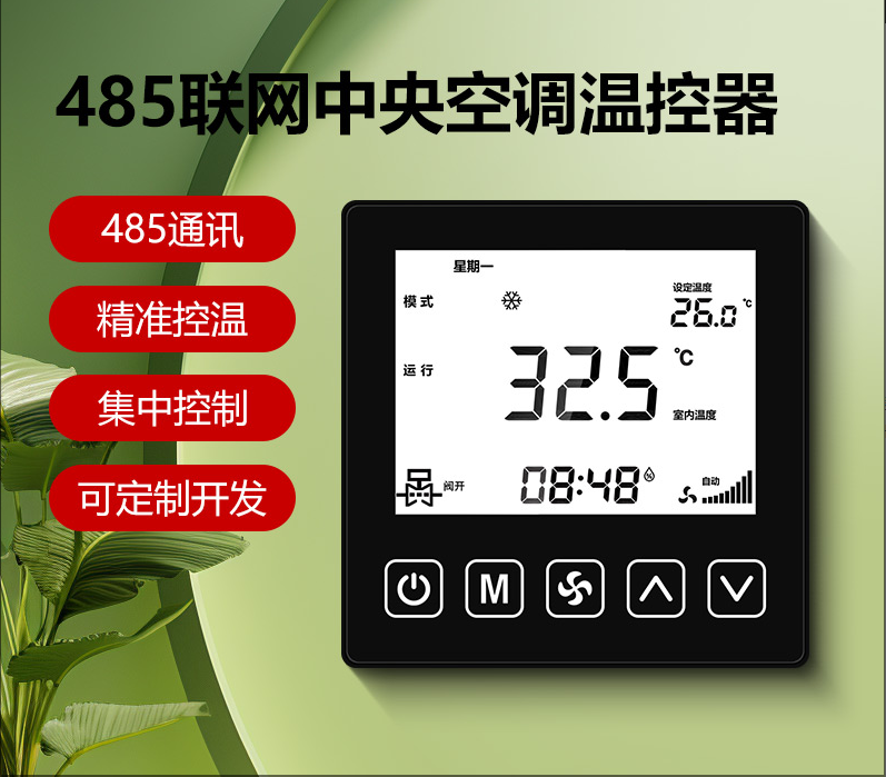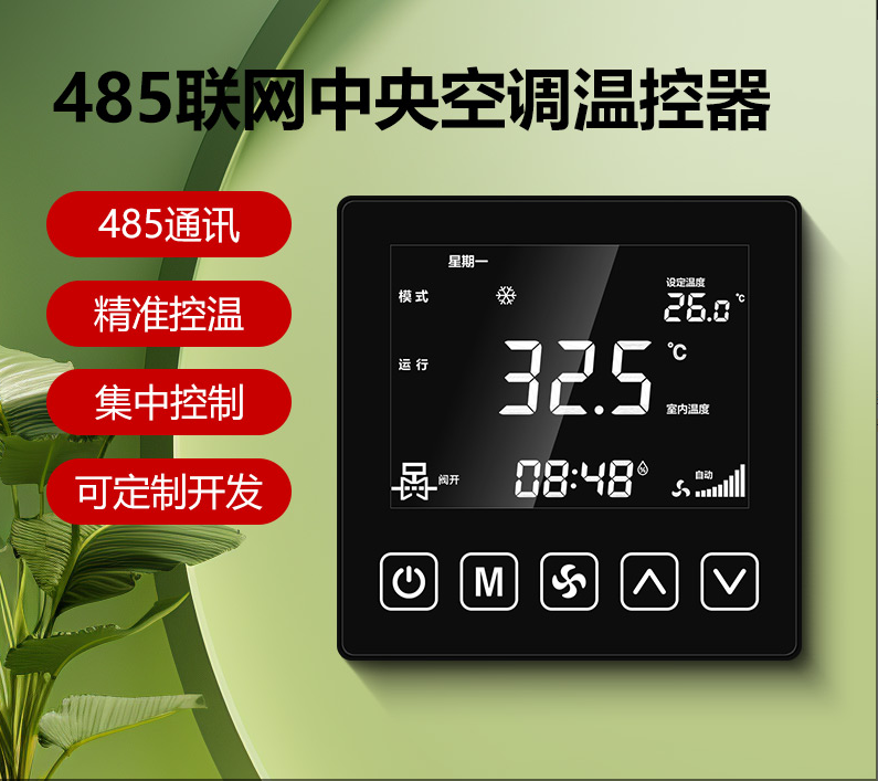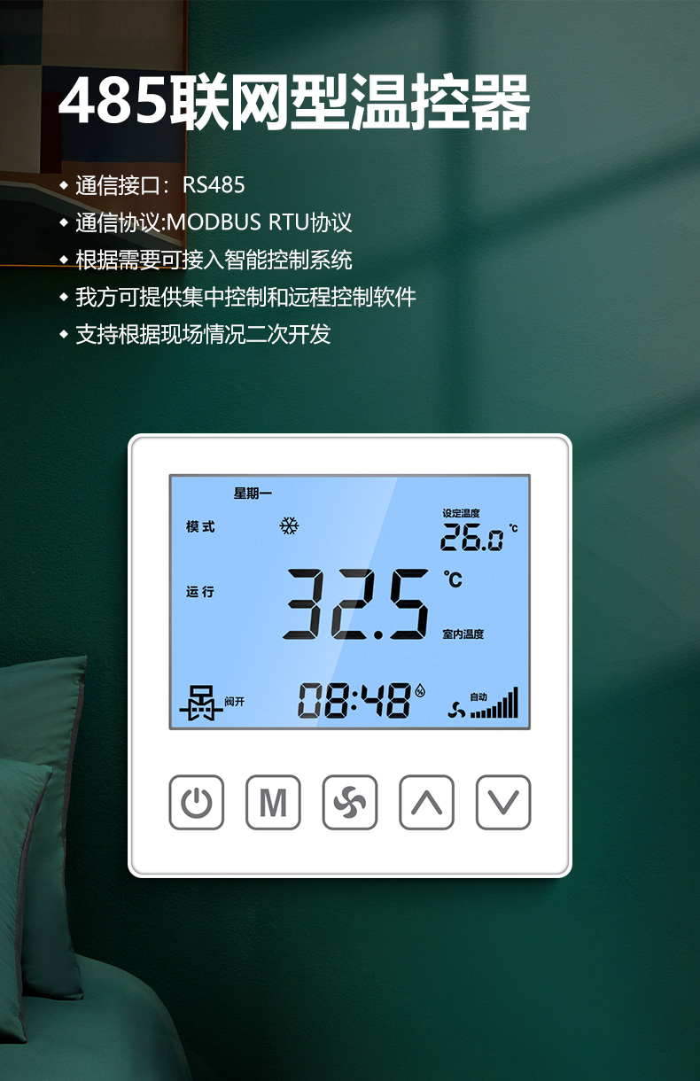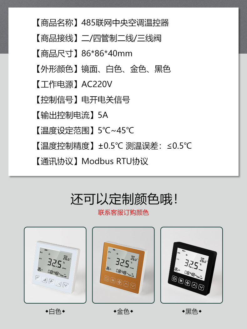 商品名称:485联网中央空调温控器商品接线:二/四管制二线/三线阀商品尺寸:86*86*66mm通讯方式:485通讯/Modbus RTU协议工作电源:AC220V控制信号:三速高中低阀开阀关功能介绍:集中控制、电费计量、分户计费、远程控制、定时控制、远程锁定功能定制:红外遥控、人体感应、湿度显示、房卡联动、门窗联动、外置抬头、API调用、定制协议、主机联动