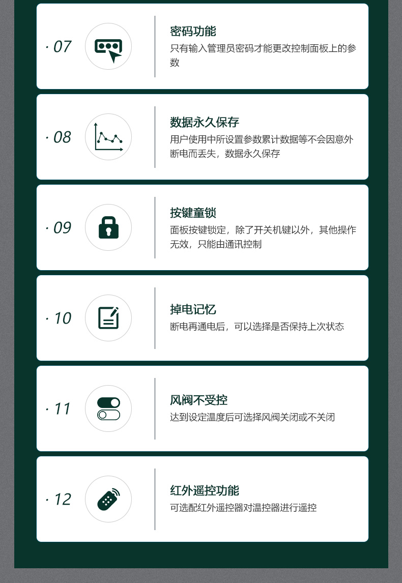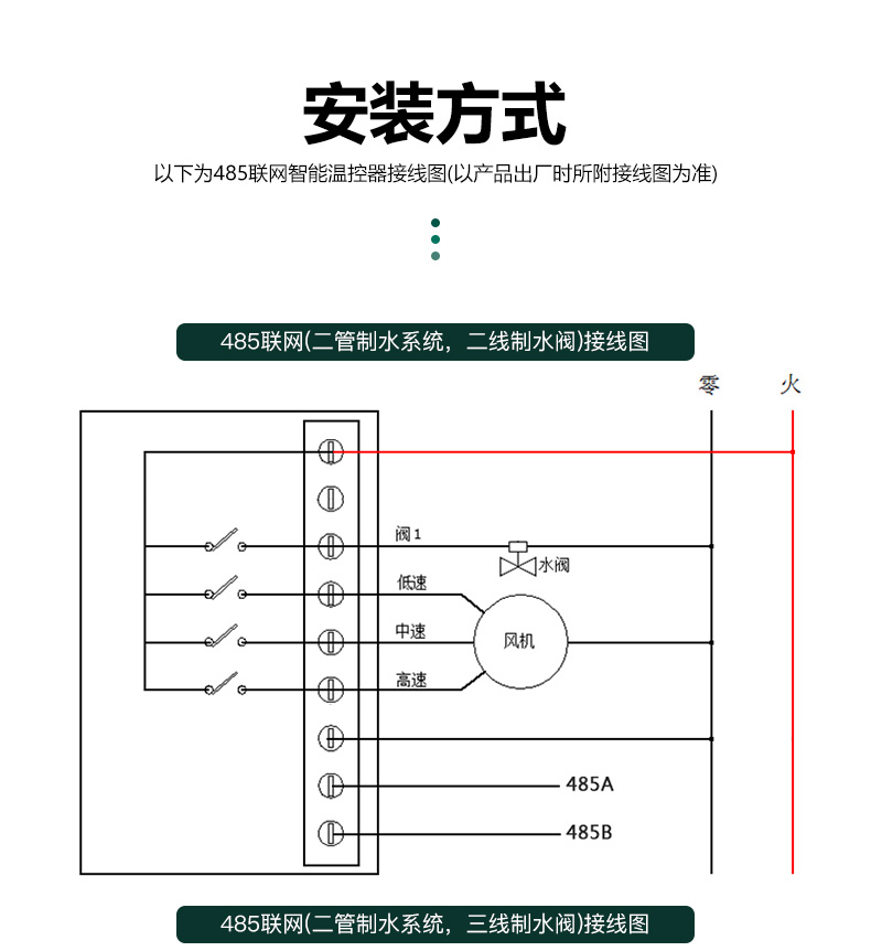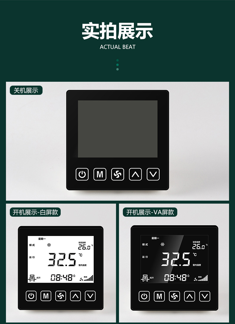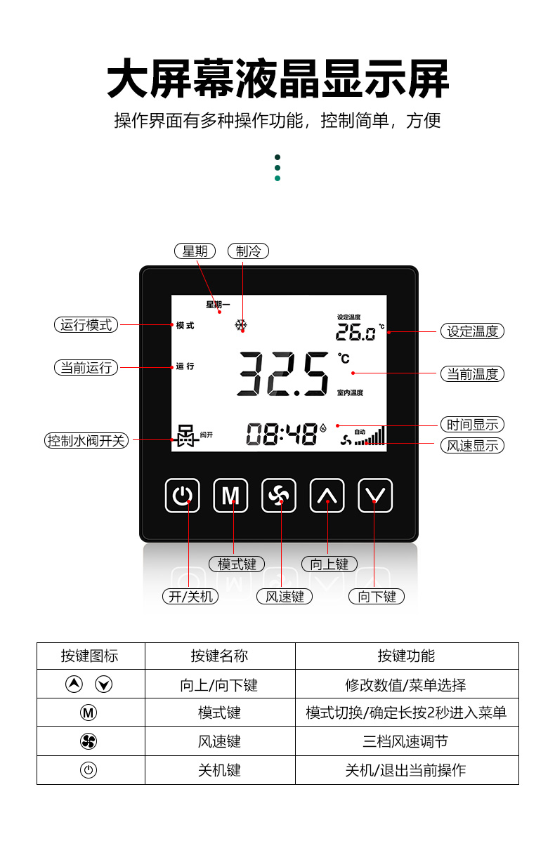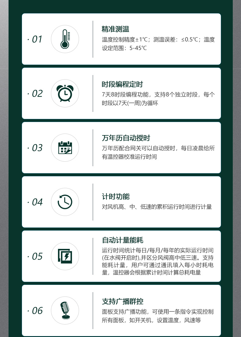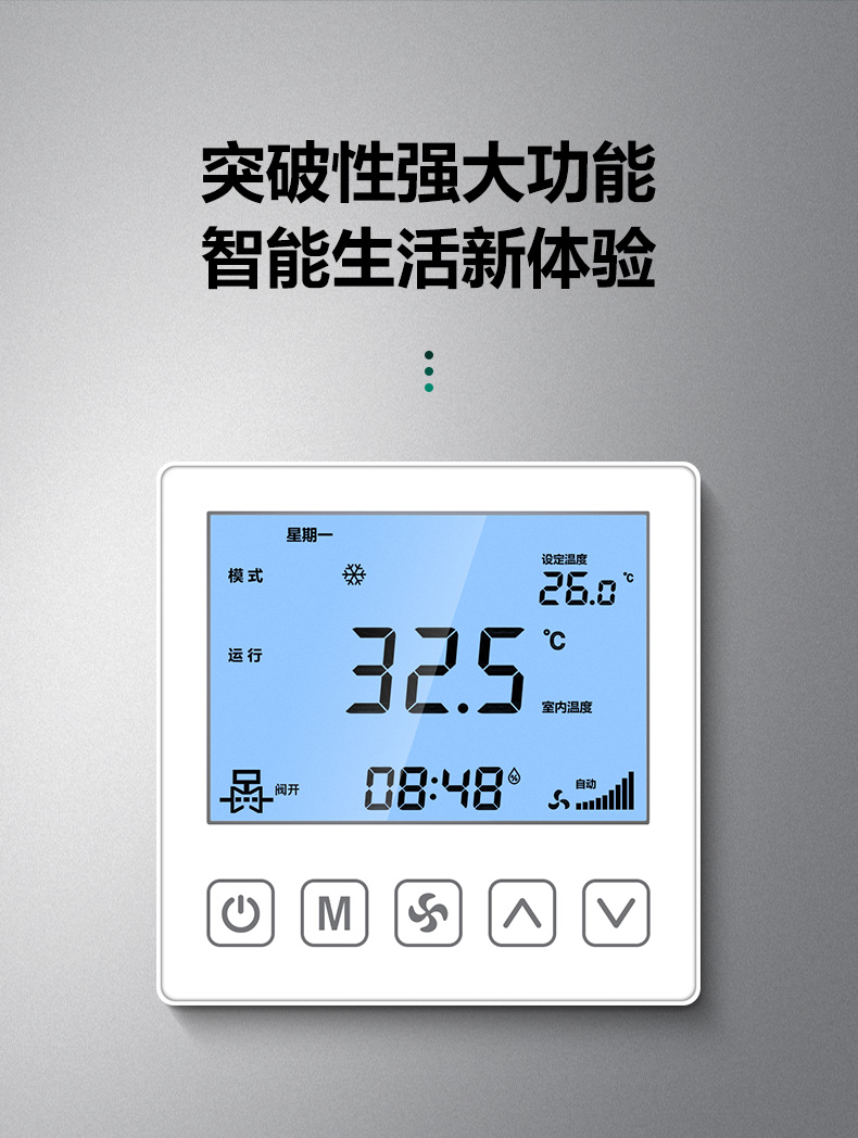 商品名称:485联网中央空调温控器商品接线:二/四管制二线/三线阀商品尺寸:86*86*66mm通讯方式:485通讯/Modbus RTU协议工作电源:AC220V控制信号:三速高中低阀开阀关功能介绍:集中控制、电费计量、分户计费、远程控制、定时控制、远程锁定功能定制:红外遥控、人体感应、湿度显示、房卡联动、门窗联动、外置抬头、API调用、定制协议、主机联动